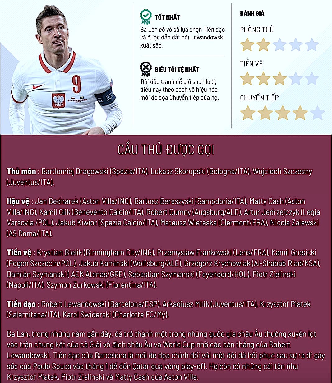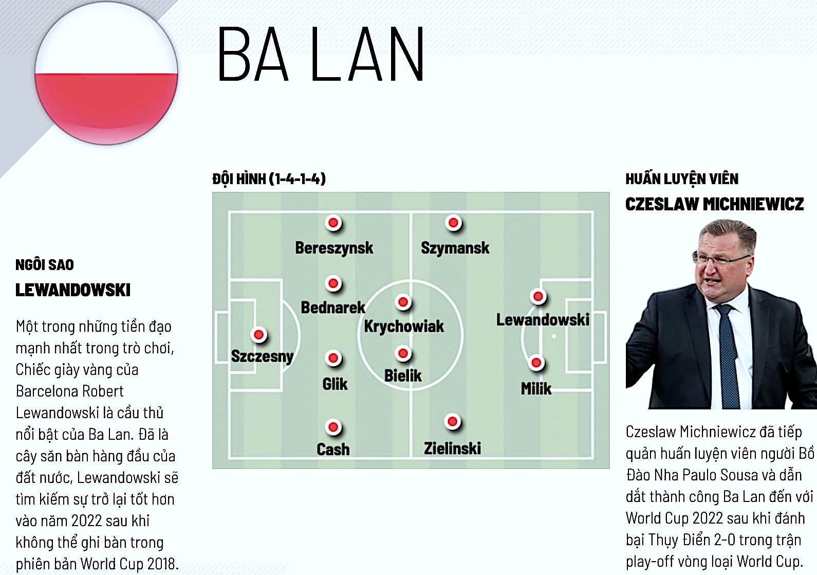 Ba Lan sẽ đi tới World Cup 2022 với quyết tâm vượt qua vòng bảng cực lớn. Tại giải đấu 4 năm trước, họ phải ra về ê chề khi chỉ có được 1 chiến thắng ở vòng bảng.